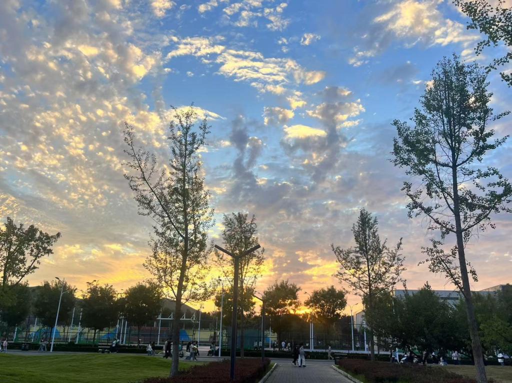 校园在晚霞的映照下宛如梦幻之境。天空似一幅色彩浓烈的油画,美轮美奂。校园的建筑在余晖下显得沉稳而庄重,草地上的路灯和树木像是忠诚的卫士,整个画面宁静且美好。(2024级化学工程与工艺(对口)1班 姚昕伟)