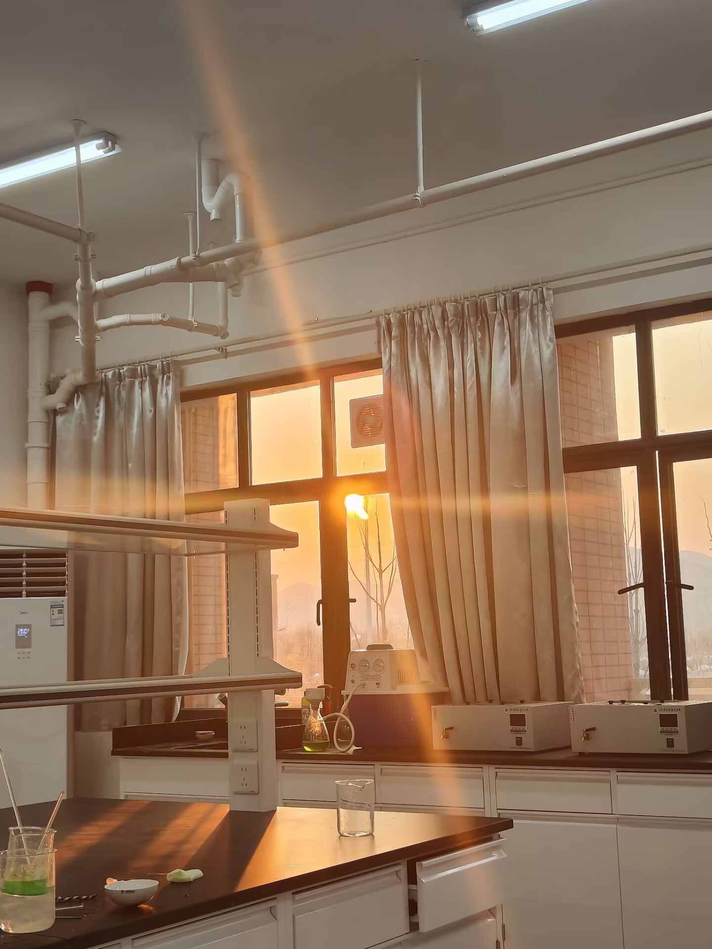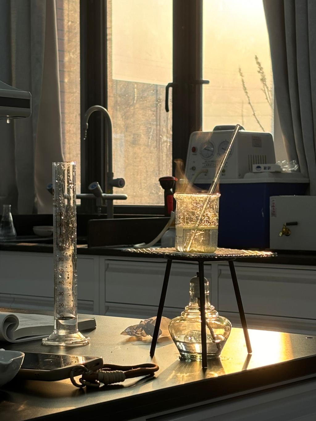 每当太阳开始西斜,晚霞就会悄悄地把天空染上一抹绚丽的色彩。实验室里的这一幕,提醒着我们,一天的努力和付出将要告一段落,希望明天更加坚定地追求理想。太阳东升西落,日复一日,一定会有一个雨停云散的清晨或傍晚,让你点亮那些看向自己的眼睛。(2024级应用化学1班 任珂馨)