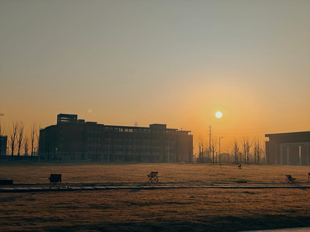 清晨的校园宛如一幅宁静的画卷。太阳从地平线缓缓升起,给校园洒下一层金纱。草地上的折叠椅静享阳光,教学楼在晨雾中矗立,树木伸展着枝干,整个校园沉浸在祥和静谧之中。(2024级化学工程与工艺(对口)1班 汪国猷)